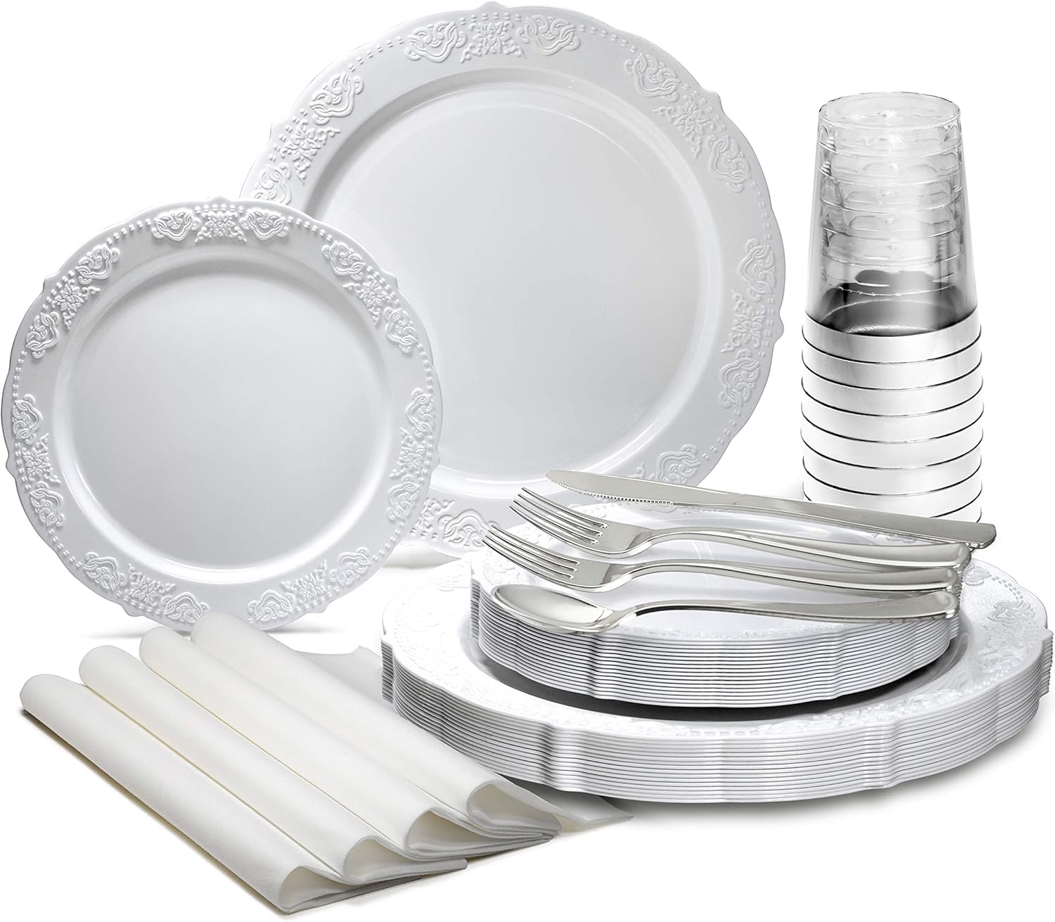 Featured Product OCCASIONS 640 Piece set (80 Guests)-Vintage Wedding Party Disposable Plastic Plates & cutlery -80 x 10.25'' + 80 x 7.5'' + Silverware + Cups + Napkins (Portofino Plain White) Reviews